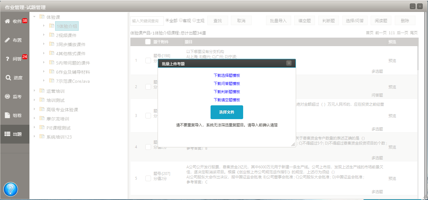 支持單選,多選,問答,判斷,填空,閱讀理解,支持批量導入。也支持特殊自定義題型開發,比如聽力后,口譯答題。操作答題,自動錄屏答題....