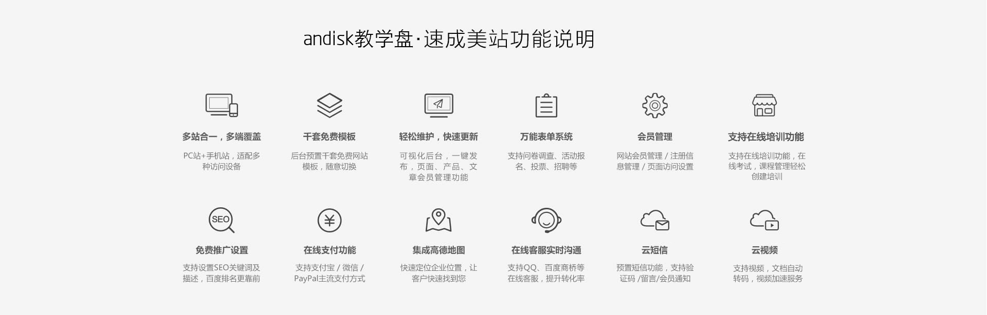 圖片、文字、會員、培訓、考試、問卷、在線咨詢、視頻,直播等40余種功能配置,隨意組合,只需拖拉拽,即可建成網站。