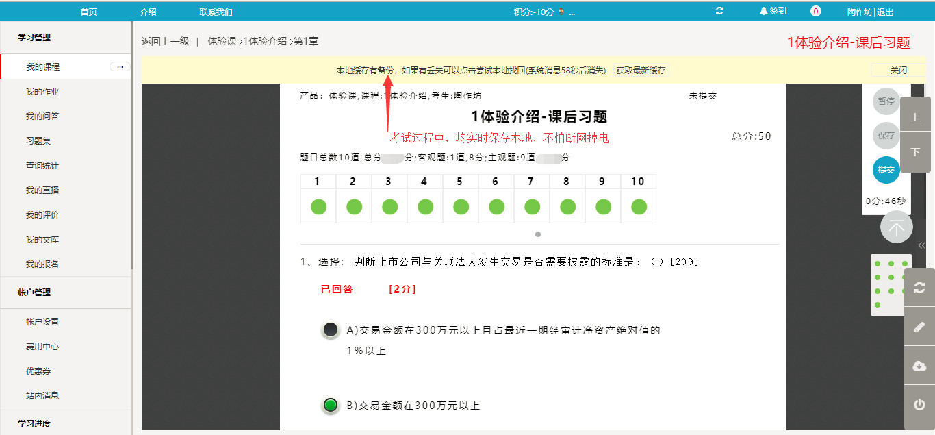 所有答題過程,實時記錄本地,并且無法破譯。斷網(wǎng)后,支持繼續(xù)答題,所有題目包括上傳附件均會保留在本地。等網(wǎng)絡通后上傳。掉電重啟也不怕,所有答題都會保留 ,限時考試計時也會繼續(xù)計時