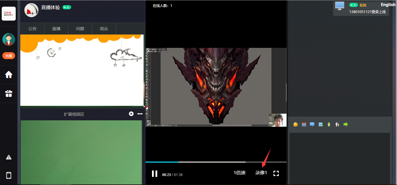 全程自動錄像,關(guān)閉直播后,也不用擔心用戶看不到,后來進入的用戶將直接觀看回放 。后臺可以將回放存下來編輯后作為資源,放到在線視頻課程里使用...