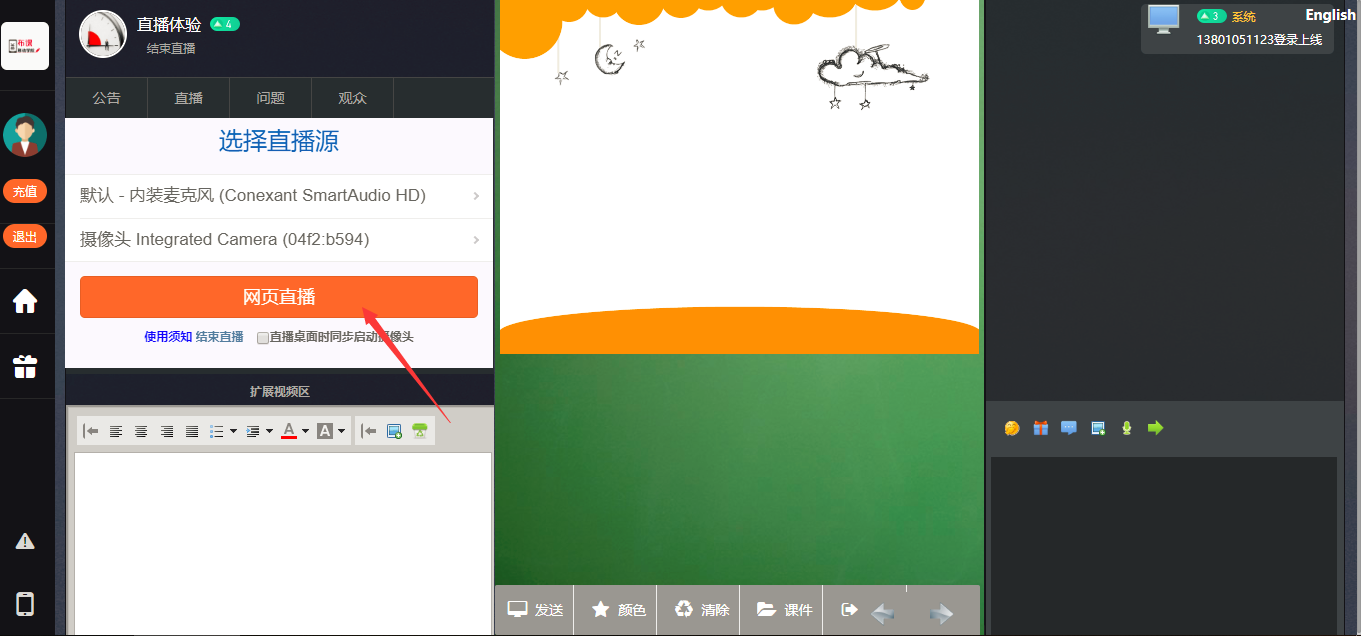 可以直播桌面,攝像頭,同時可以打開文件進行講解,所有點畫操作會同步直播給用戶....