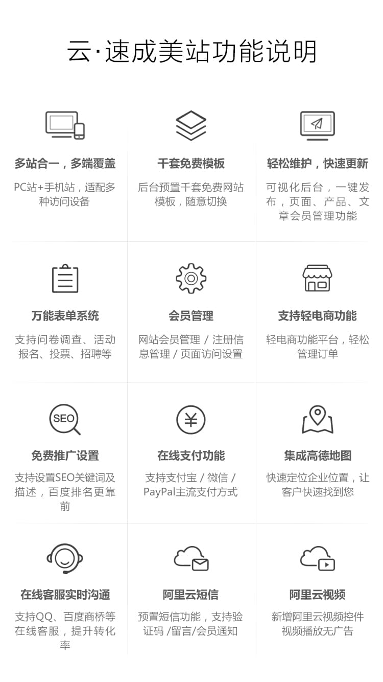支持云視頻控件,視頻播放無廣告,預(yù)置短信功能,支持網(wǎng)站會員手機號驗證/付款發(fā)貨/留言評價等短信通知功能